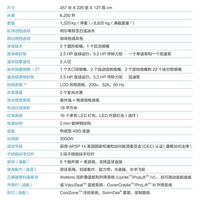 尺寸:457*226*127 cm水量:6250升座椅:3人位漩水按摩噴嘴:27個重量:1320 kg(凈重)/ 8820 kg(滿載重量)