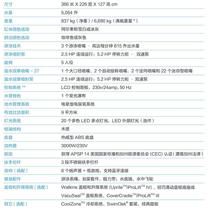 尺寸:366*226*127 cm水量:5054升座椅:5人位漩水按摩噴嘴:27個(gè)重量:837 kg(凈重)/ 6680 kg(滿載重量)