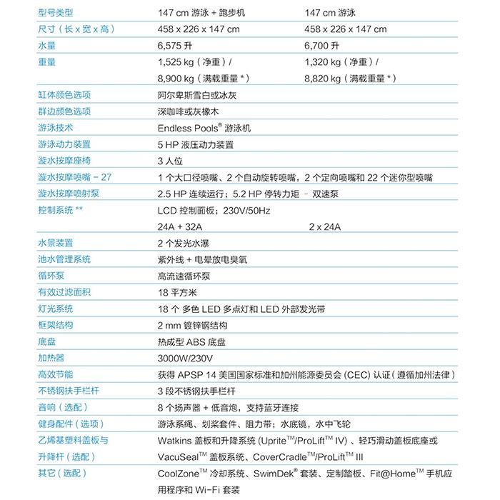 型號(hào)類型:147 cm游泳+跑步、147 cm游泳尺寸:458*226*147 cm、458*226*147 cm水量:6575升、6700升漩水按摩座椅:3人位漩水按摩噴嘴:27個(gè)重量:1525 kg(凈重)/ 1320 kg(凈重)