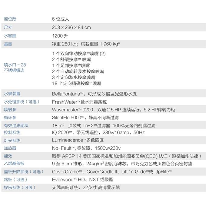 座位數(shù):6位成人尺寸:203*236*84 cm水量:1200 升噴嘴:28個(gè)重量:凈重280 kg;滿載重量1960 kg